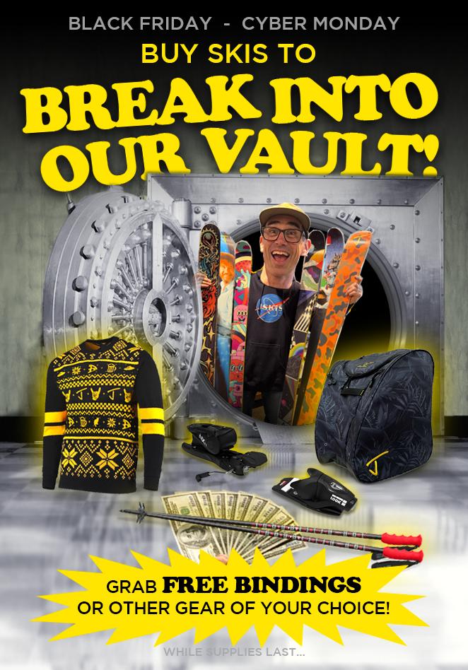 Buy skis to break into our vault this Black Friday weekend. Loot free bindings, gear, or $100 gift cards while supplies last!