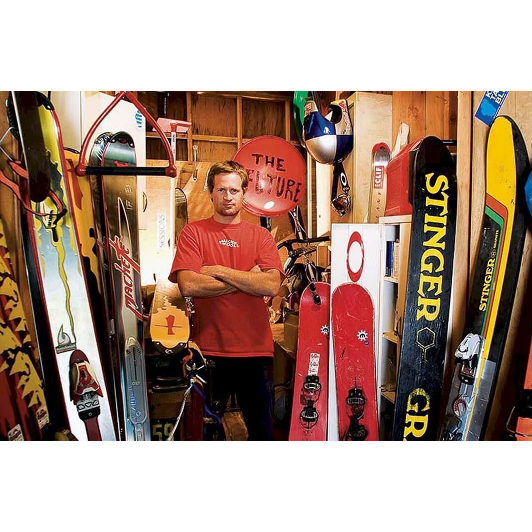 That water ski colorway is exactly what you're looking at on this new Skibladezzz graphic. Bold, retro, and absolutely unmistakable on the hill. A tribute to Shane the innovator, Shane the not so serious skier, and of course… Saucerboy himself. As Saucerboy says, "There's something really cool about getting scared. I don't know what." So put 'em on your feet, take a swig, wack your pole and drop in!